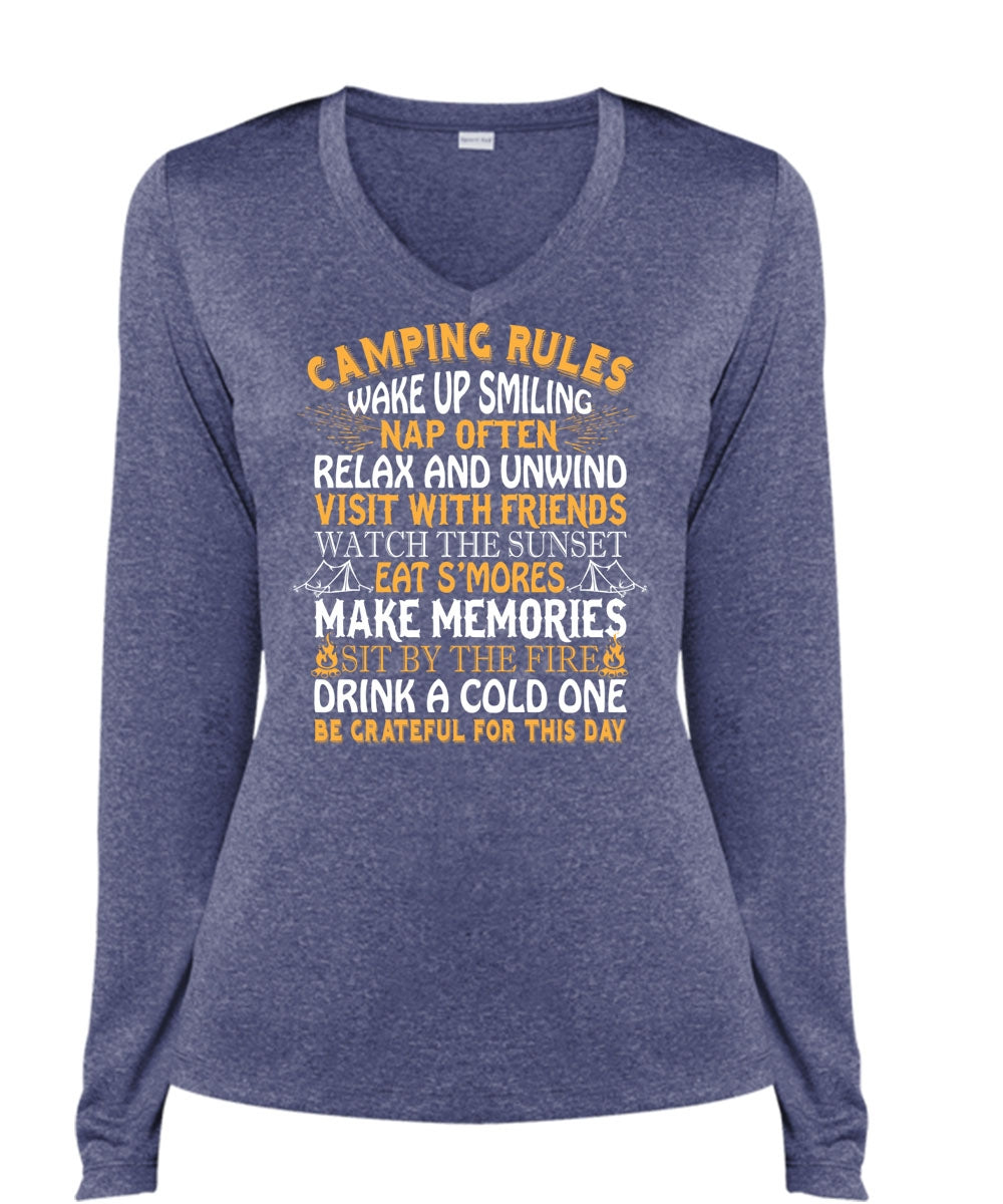 Camping Rules Wake Up Smiling Nap Often Relax And Unwind T Shirt, Relax T Shirt (Ladies LS Heather V-Neck)