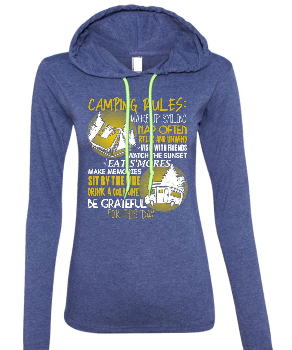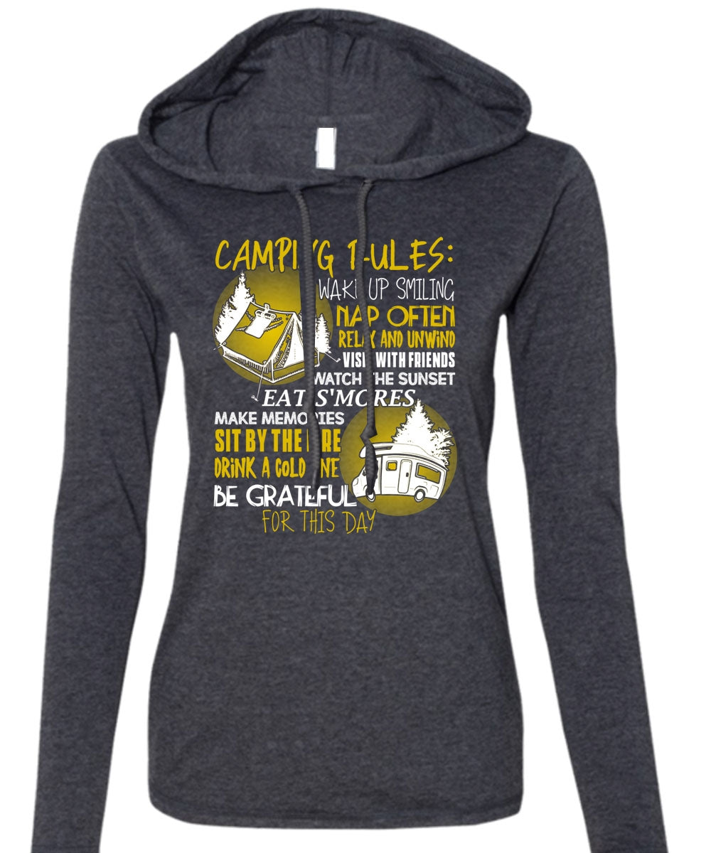 Camping Rules Wake Up Smiling T Shirt, Sit By The Fire T Shirt (Anvil Ladies Ringspun Hooded)