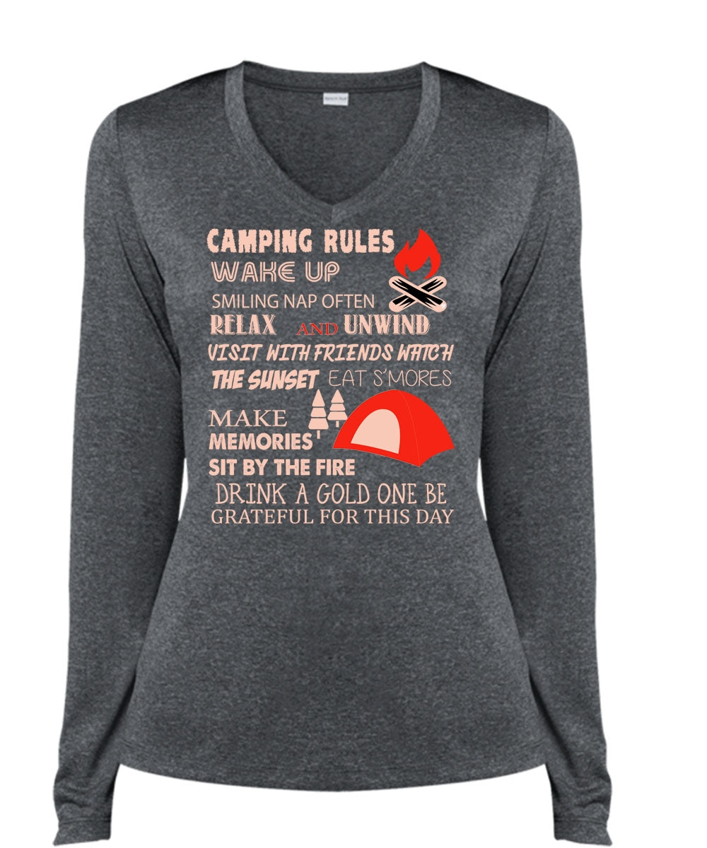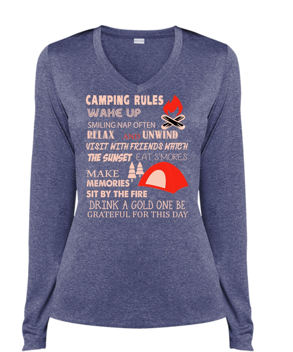 Camping Rules Wake Up T Shirt, Make Memories Sit By The Fire Shirt (Ladies LS Heather V-Neck)