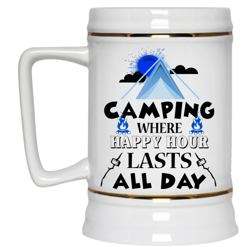 Camping Where Happy Hour Lasts All Day Cup, Funny Mug (Beer Mug)