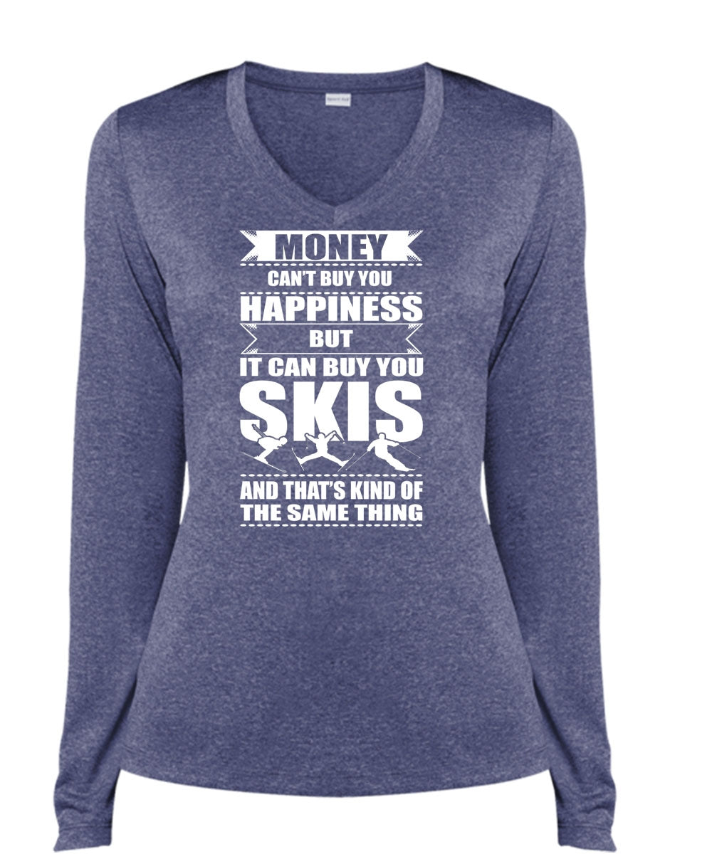Can Buy You Skis T Shirt, Money Can't Buy You Happiness T Shirt, Cool Shirt (Ladies LS Heather V-Neck)